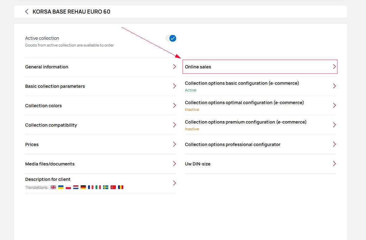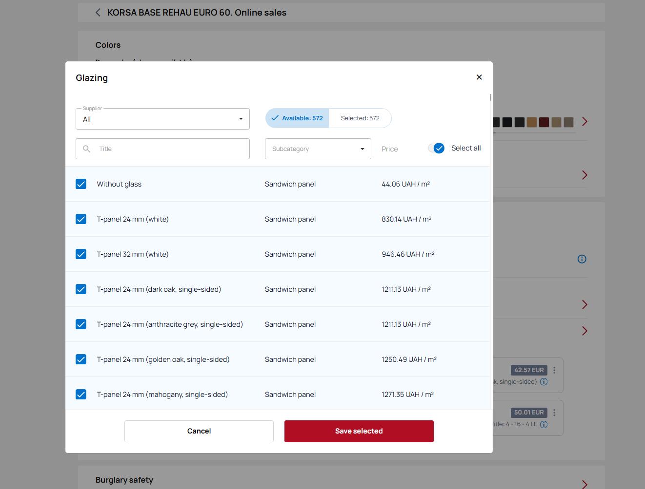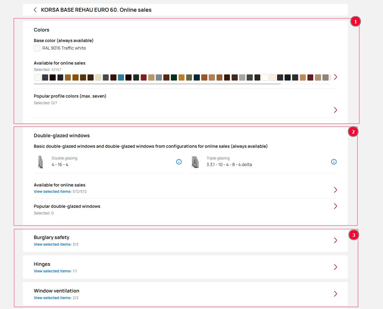 Available for online sales – this is the list of glazing units available for online selection. The list can be reduced to the desired amount for display on the website in the product configuration settings. The counter shows the number of selected units relative to the number of compatible ones.