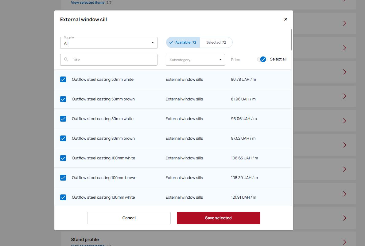 To select the additional assortment, click on the desired assortment category block. A modal window will open with the list of elements. All additional items are taken from the collection compatibility settings. By default – all available items are selected for each category.