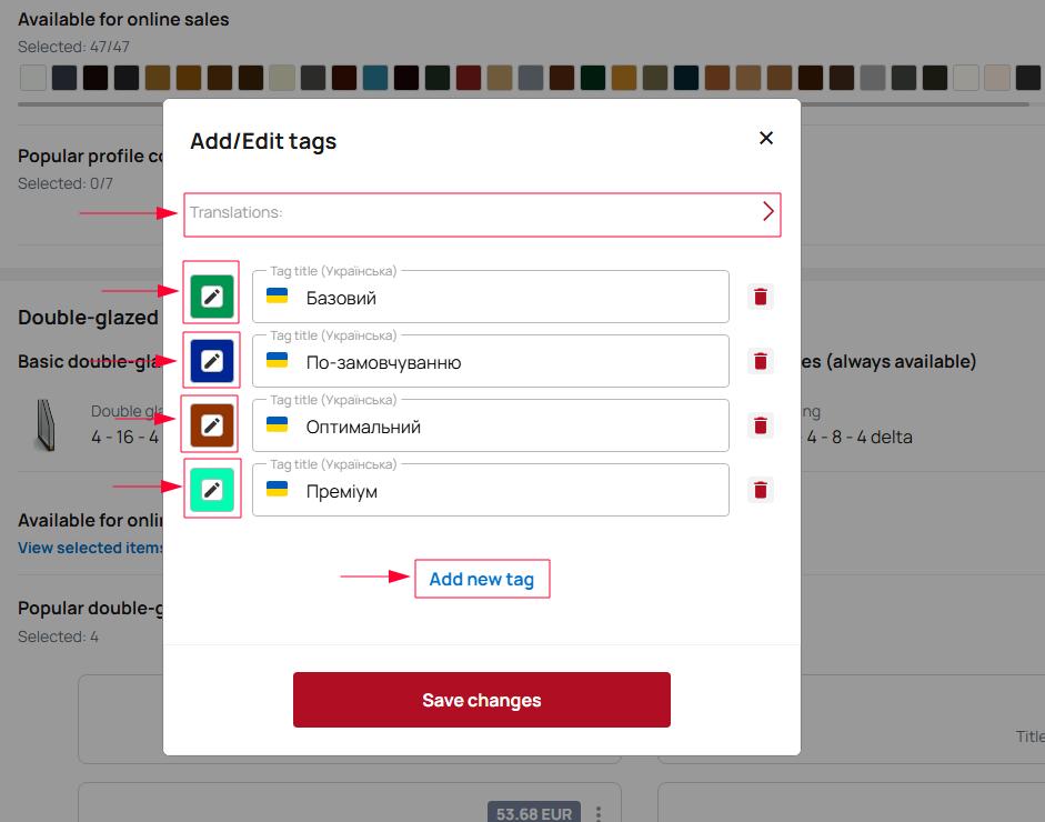 To select which colors (from the available ones) will be shown on the website, click on the Available for online sales block. A modal window will appear where you can select the desired colors.