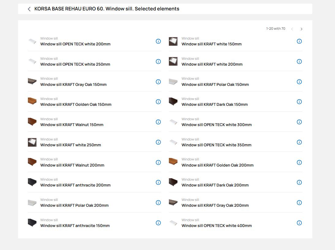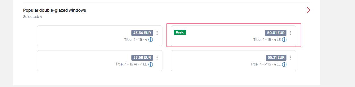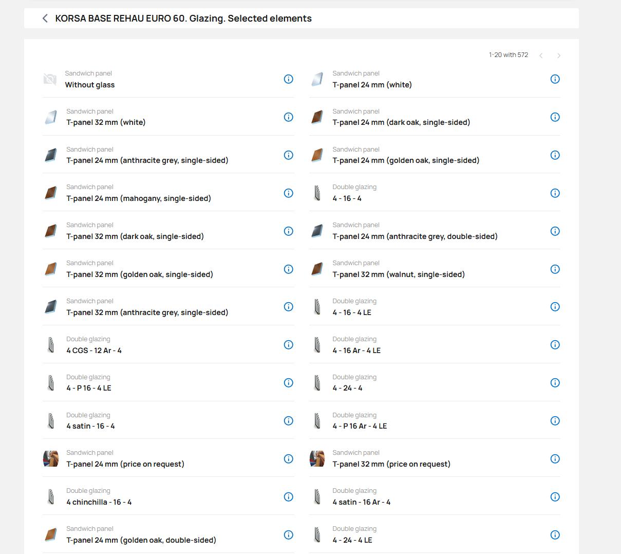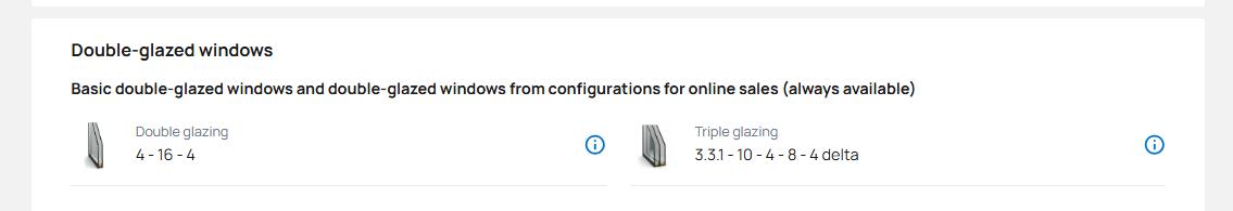 Basic double-glazed windows and double-glazed windows from configurations for online sales (always available) – this is an informational block, elements here cannot be edited. The base glazing unit is the default element selected in the basic collection parameters.