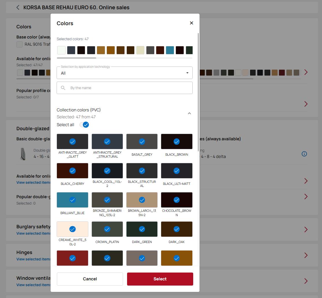 Available for online sales – (profile colors pulled from the “collection colors” settings). The number of colors in this list can be reduced to the desired amount for display on the website during product configuration. Clicking on a color opens a modal window with its image and description.