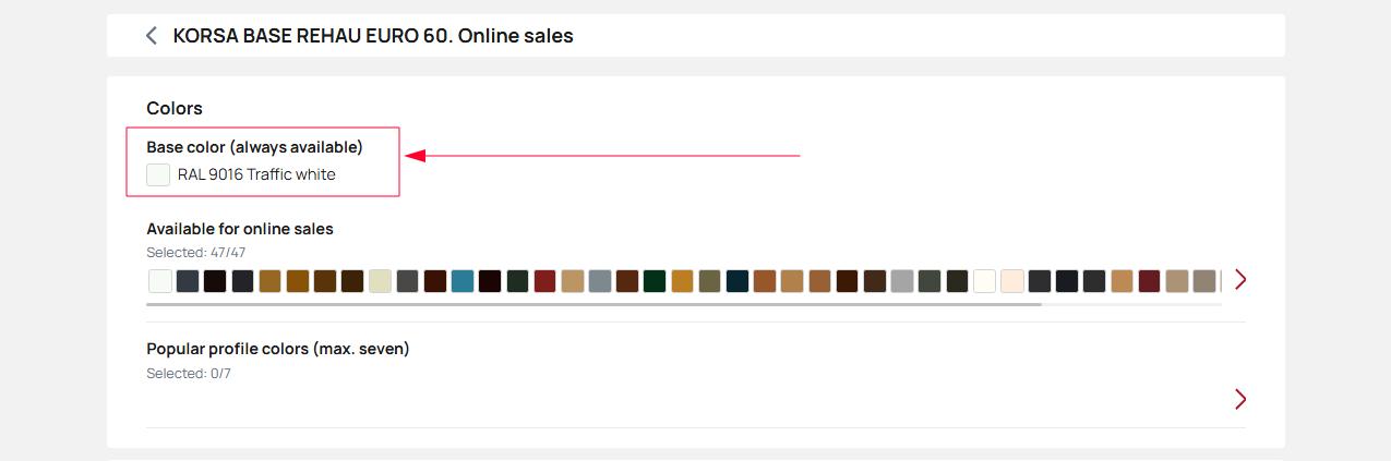 Popular profile colors – up to 7 colors that, together with the base color, will be displayed on collection cards (collection selection page), on product pages, and in the collapsed color selector on the options modification page. If no colors are selected, the system will automatically choose them from the ones available for online sales.