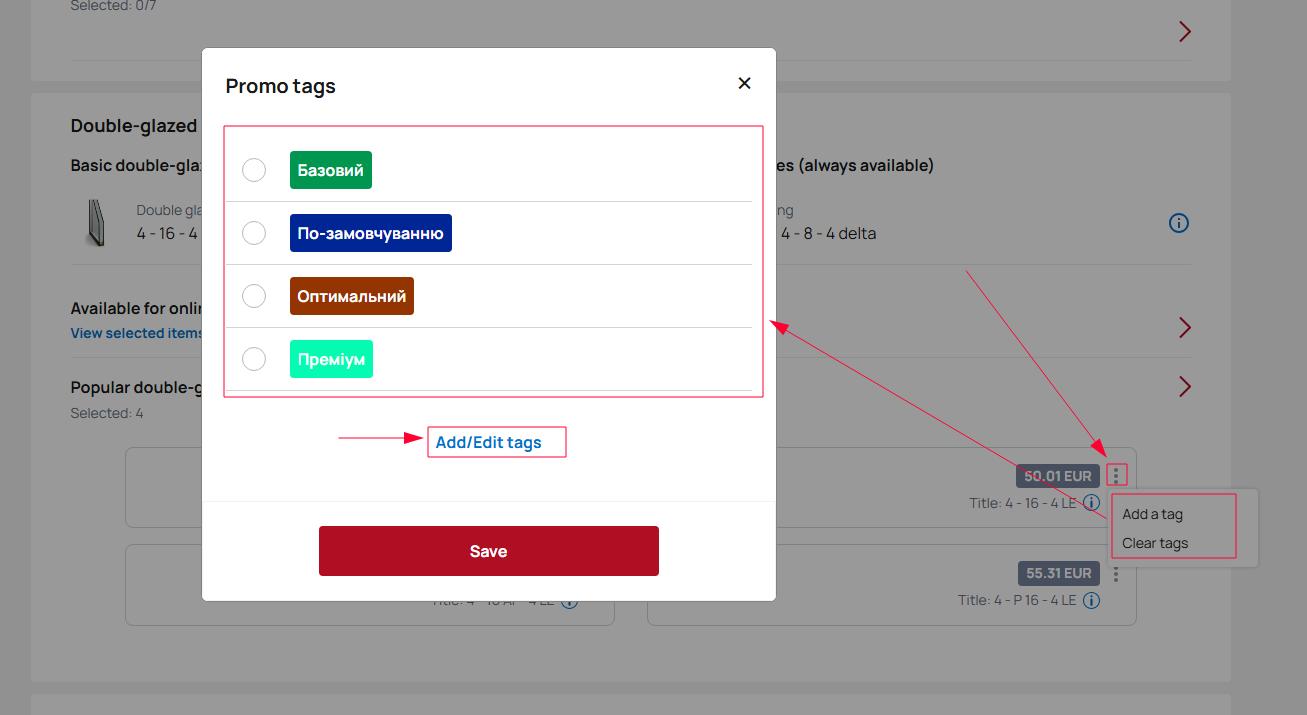 You can add labels (promo tags) to popular glazing units. A maximum of 2 labels can be assigned to each unit.