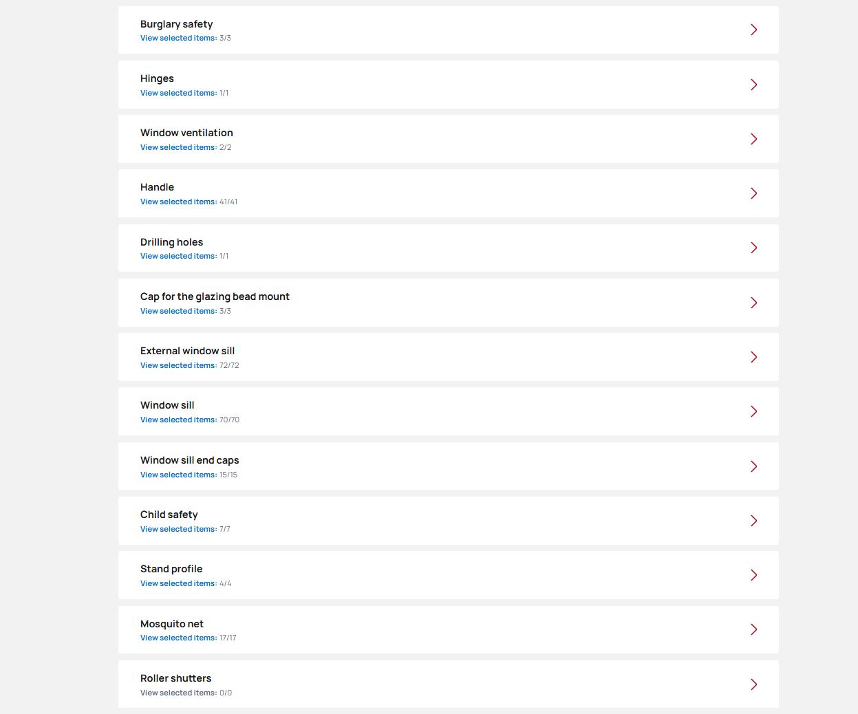 This section contains a list of additional selectable items. The list can be reduced to the desired quantity for display on the website in the product configuration settings. The counter shows the number of selected items relative to the number of compatible ones.