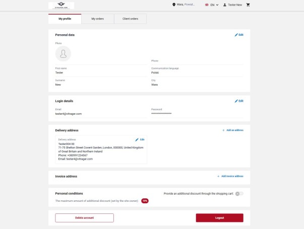 To add an address, click the Add Invoice Address button, after which a data entry modal window will appear. - Personal conditions – in this block, the subdealer can enable/disable the ability to provide an additional discount on the order in the shopping cart. The additional discount is entered in the website’s shopping cart before finalizing the order (More details ➤ here). The maximum discount the sub-dealer can provide to the client is also displayed. More details on configuring the maximum discount for a sub-dealer can be found ➤ here