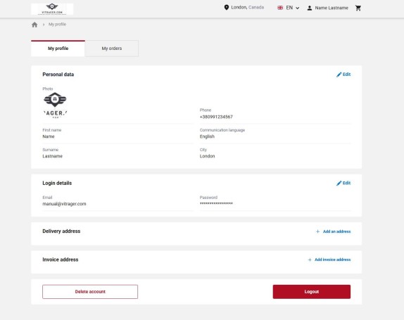 This section of the website allows the user to manage their account — update personal information, view created orders, and add delivery addresses.